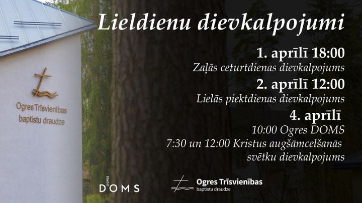 Četrus no pieciem dievkalpojumiem būs iespēja vērot arī tiešsaistē. 1., 2. un 4.aprīļa pl.12 notiekošos dievkalpojumus varēs vērot draudzes Youtube kanālā youtube.com/otbaznica , savukārt 4.aprīļa Ogres DOMS būs skatāms youtube.com/OgresDOMS
