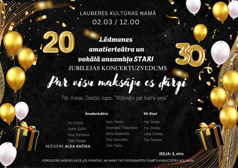 2. martā plkst. 12.00 Lauberes Kultūras namā un plkst. 15.00 Suntažu Kultūras namā notiks Lēdmanes amatierteātra un vokālā ansambļa "Stari" jubilejas koncertuzvedums "Par visu maksāju es dārgi". Ieejas maksa - 3 eiro.